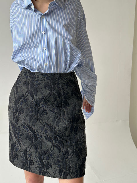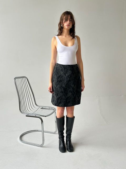 High-waisted midi skirt crafted from a heavy wool fabric in a grey tone, featuring subtle dark blue embroidered floral detailing. Structured yet wearable, with practical pockets and a refined silhouette. A timeless Marni piece with understated character.